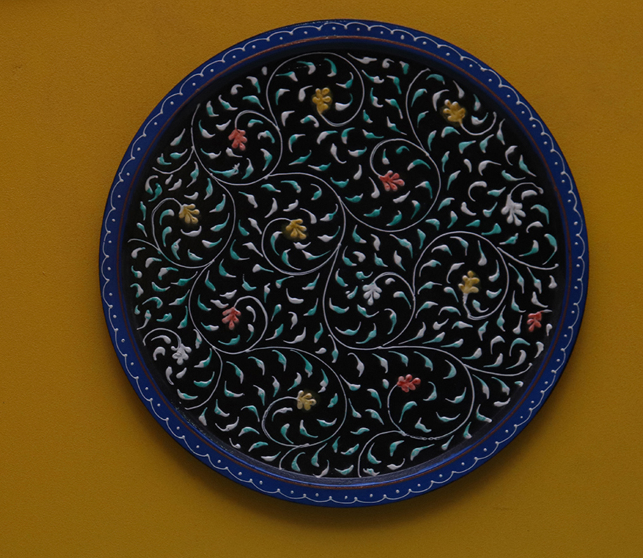This is a beautiful wooden wall hanging plates and embossed painted Indian art.