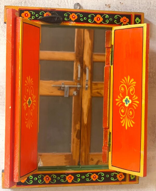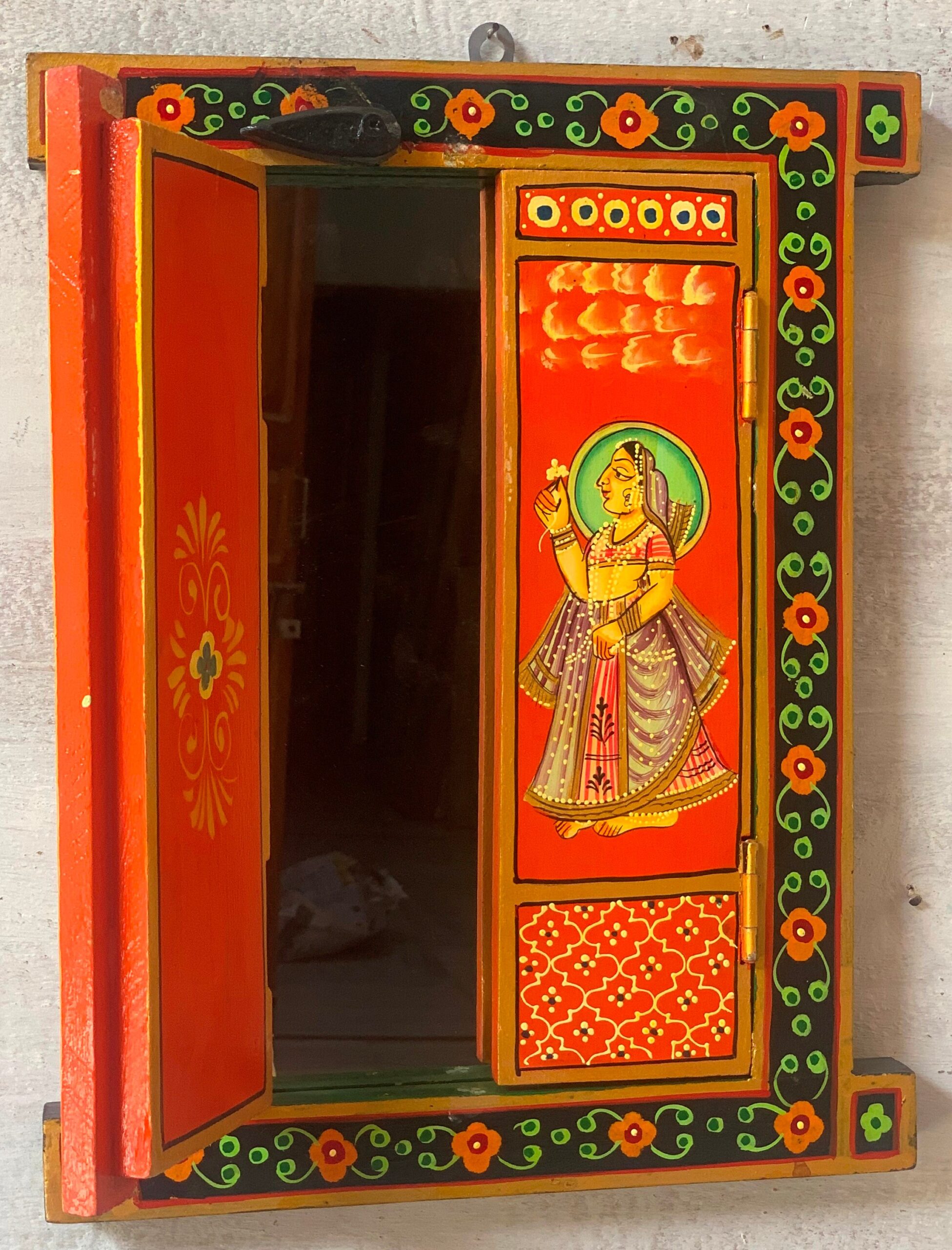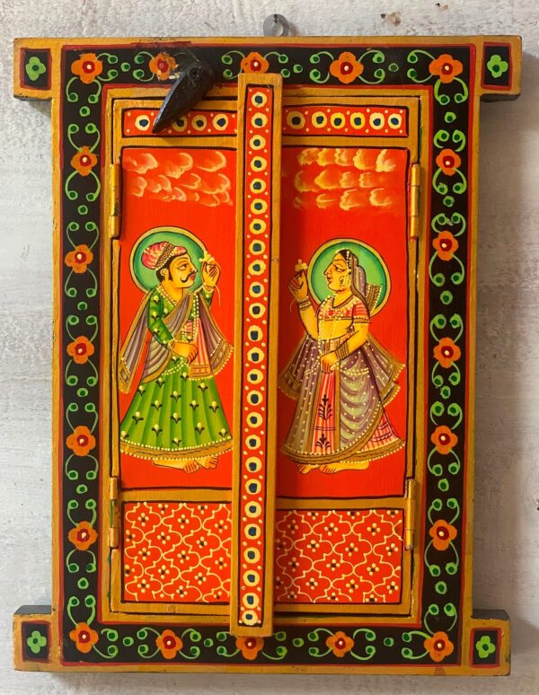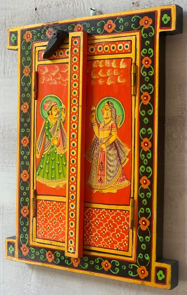 Wall decor can truly transform the ambiance of a room. Hang or mount the wooden Raja Rani painted window in a prominent place in your home, such as above a mantel, on a feature wall, or as a focal point in a living room or bedroom. You can also incorporate additional decor elements around the window to enhance its visual impact.