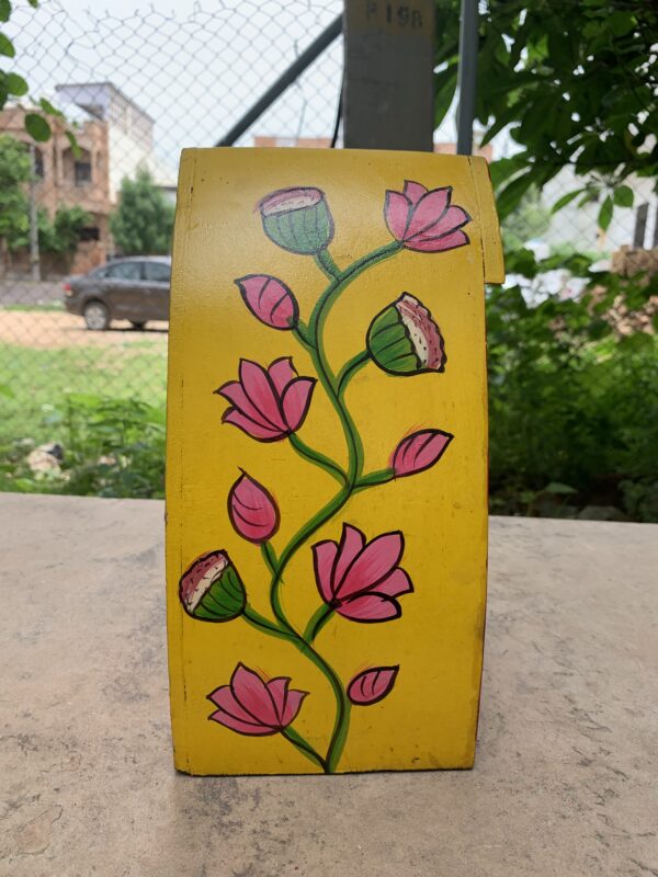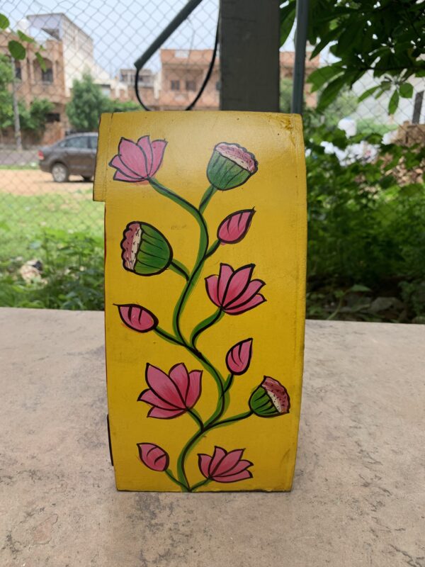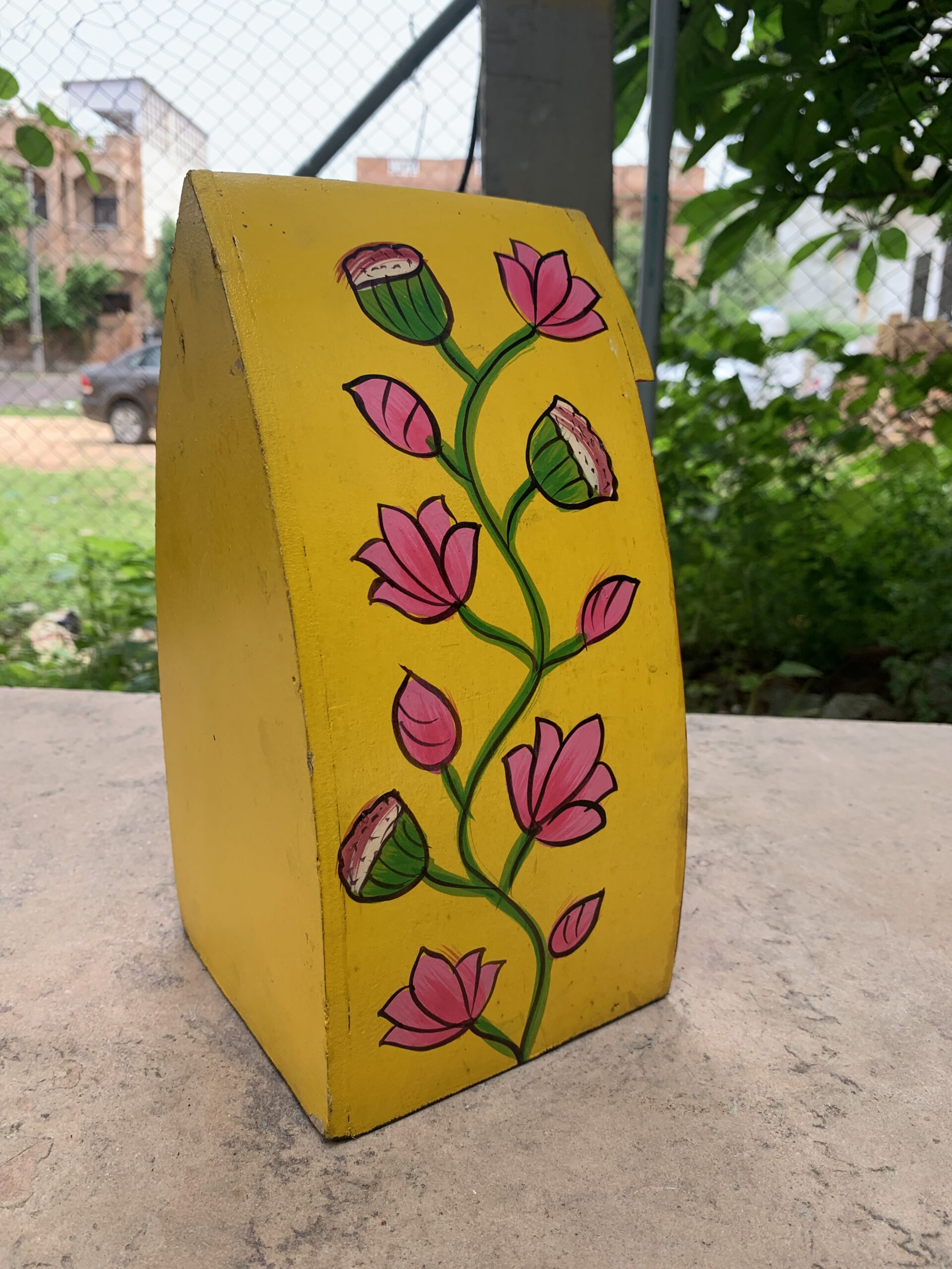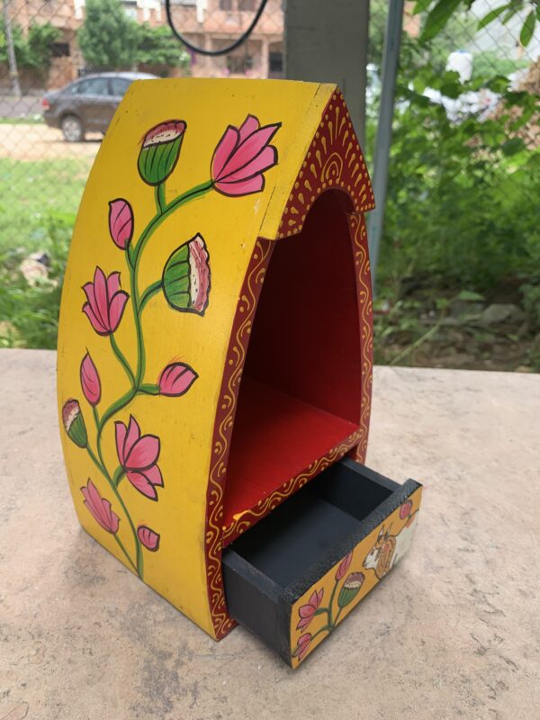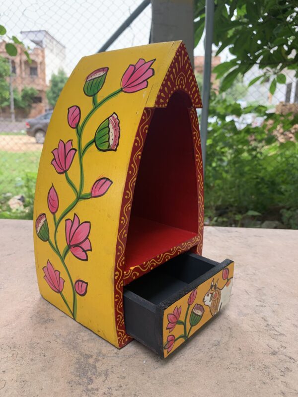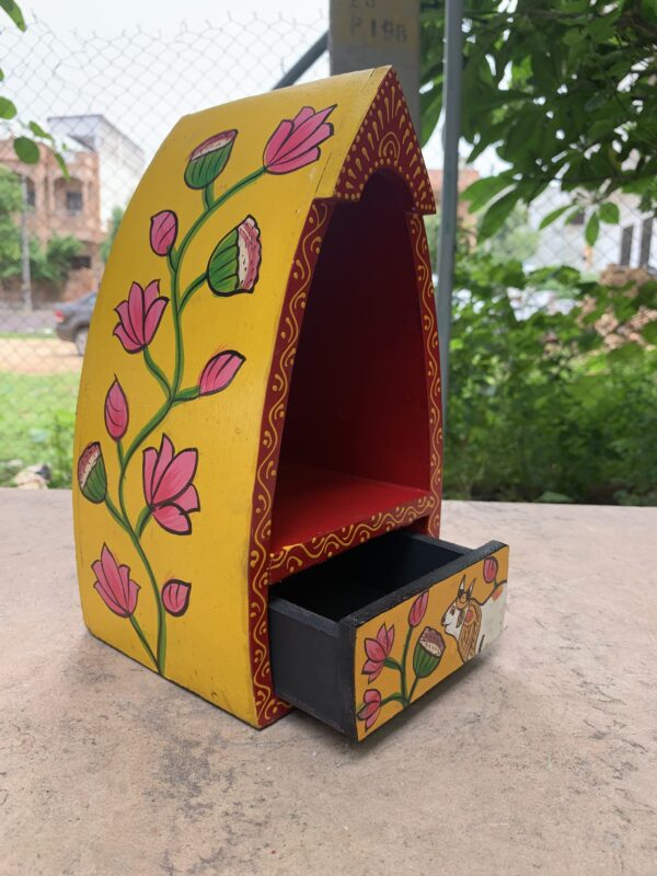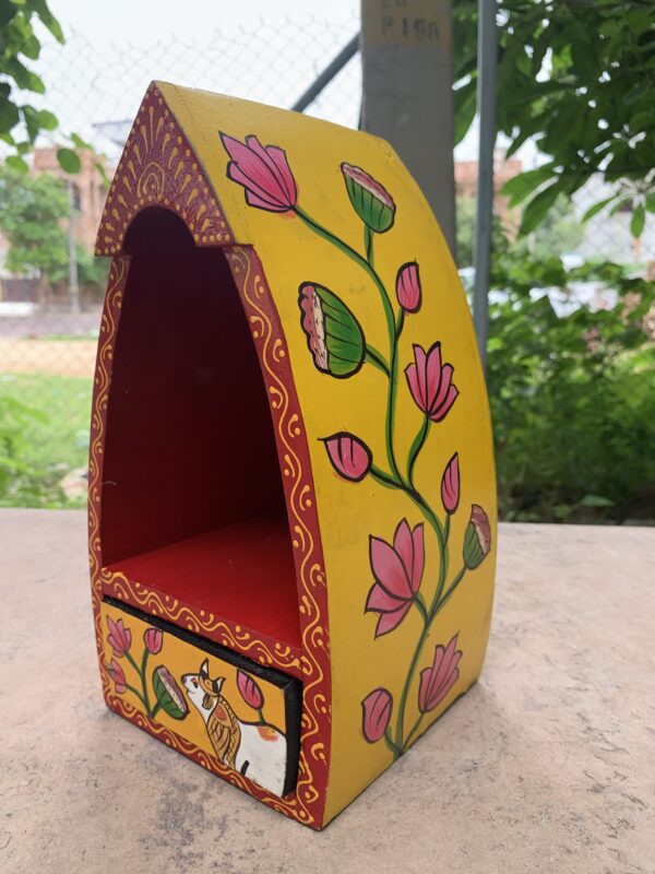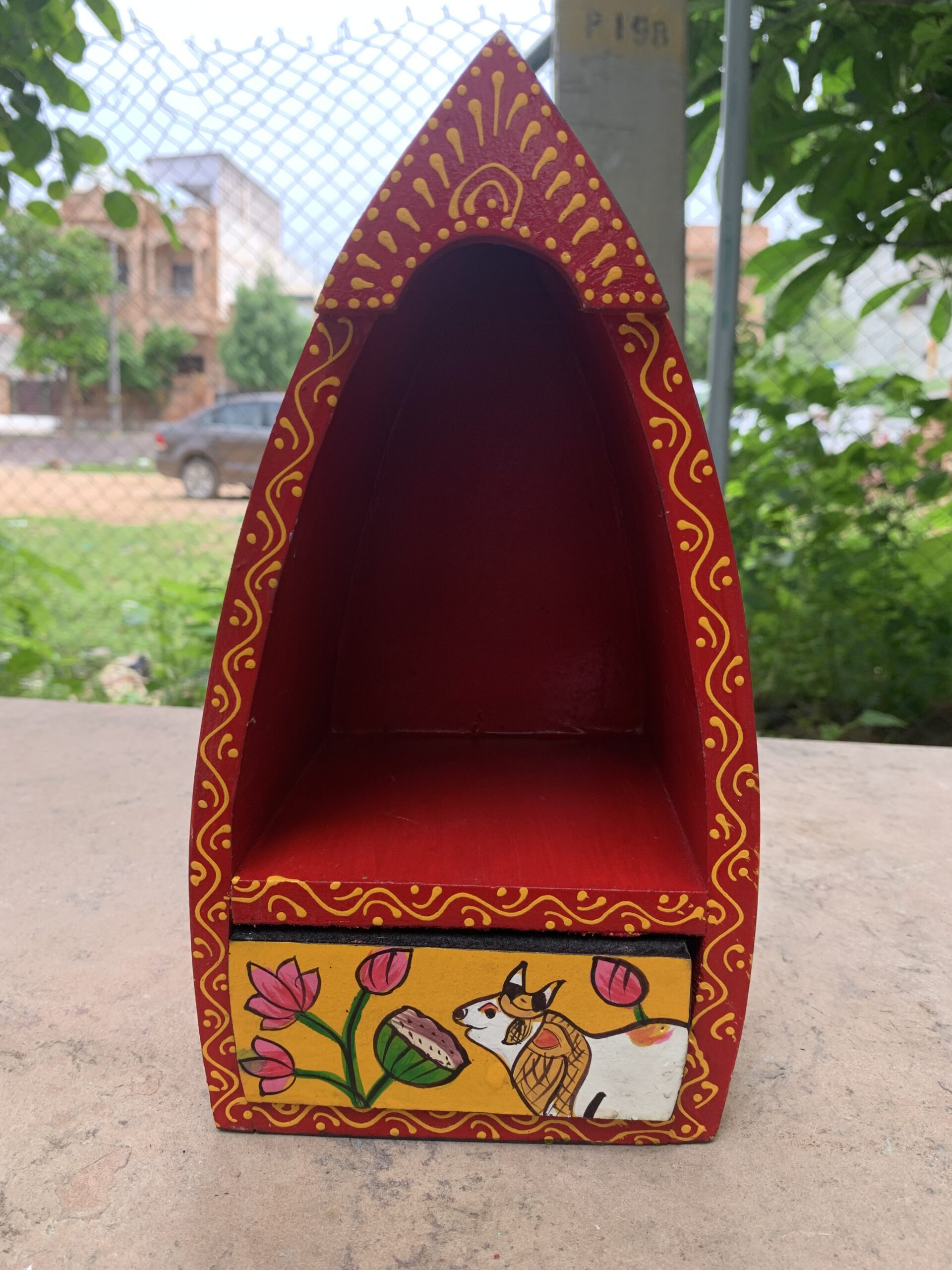 This is a hand painted and handmade wooden rajasthani wall hanging mandir.Each piece is handmade and it takes a lot of time and effort to make one piece.